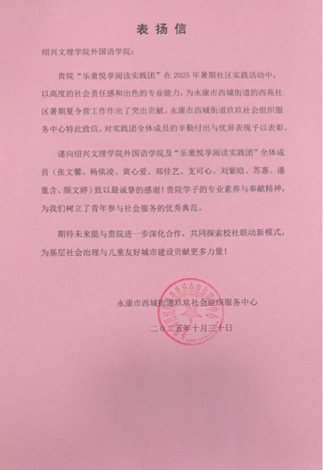 近日,我校竞猜网收到来自永康市西城街的表扬信,感谢我校“乐童悦享阅读实践团”的张文馨、杨依凌、黄心爱、郑佳艺、支可心、刘紫晗、苏惠、潘胤含、颜文婷等9位同学为永康市西城街道社区暑期夏令营工作作出突出贡献。